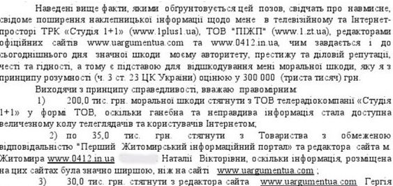 Журавский просит суд: признать информацию, распространенную о нем вышеперечисленными СМИ, недостоверной и такой, которая унижает честь, достоинство и деловую репутацию; изъять из интернета распространенную информацию и опубликовать опровержение; взыскать моральный ущерб в сумме 300 тыс грн. (200 тыс.грн — со «Студии »1+1«, по 35 тыс.грн. с двух житомирских сайтов и 30 тыс.грн. с сайта «Аргумент»).