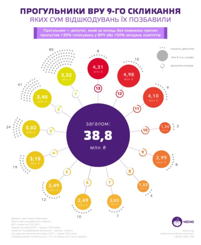 На сайте «Руху ЧЕСНО» также обнародовали инфографику, на которой указаны 47 нардепов, нынешних и бывших, которых лишили выплат за прогулы на общую сумму 20,4 млн гривен.
