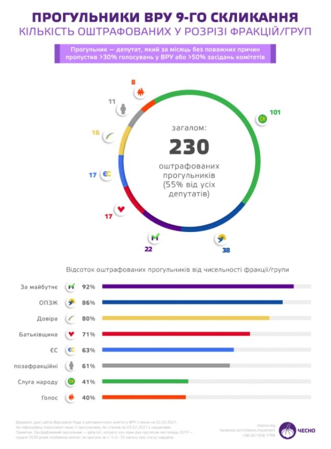 В остальных фракциях и группах оштрафовали более 50% их членов. Лидером по количеству прогульщиков является группа «За майбутнє»: за указанное время лишали выплат почти всех ее членов.