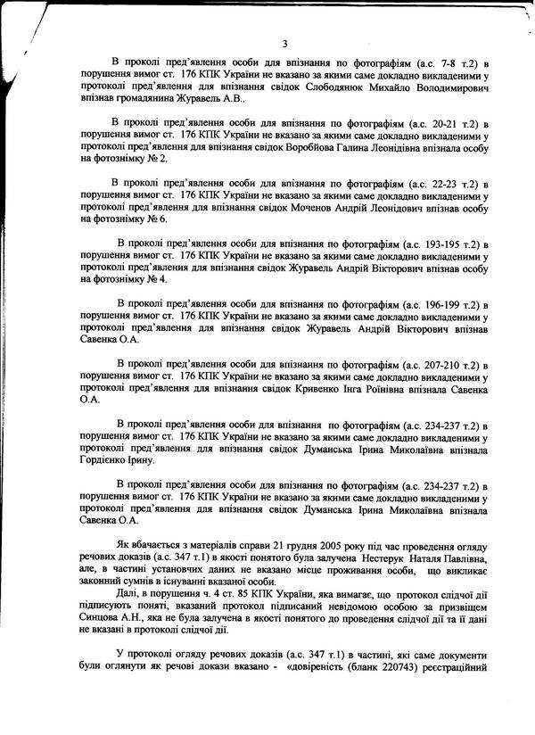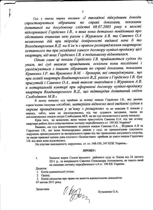 Справа весь час розглядалась з багатьма порушеннями, зокрема, несвоєчасний розгляд справи, не забезпечення явки всіх свідків, невідповідність висновків суду фактичним обставинам справи, штучно створені обставини, відповідно до яких позивачка є потерпілою в кримінальній справі, необгрунтовані докази, судові засідання без участі захисника, невчасне ознайомлення з матеріалами справи, запізнення вручення вироку (24 лютого 2011р., тобто судове слідство тривало 6 років, було винесено вирок, згідно якого Савенка О.А. було засуджено за ч.4 ст.209 КК України до 8 років позбавлення волі з конфіскацією майна; за ч.3 ст.28 та ч.2 ст.209 КК України його було виправдано), що призвело до порушення строків апеляції.