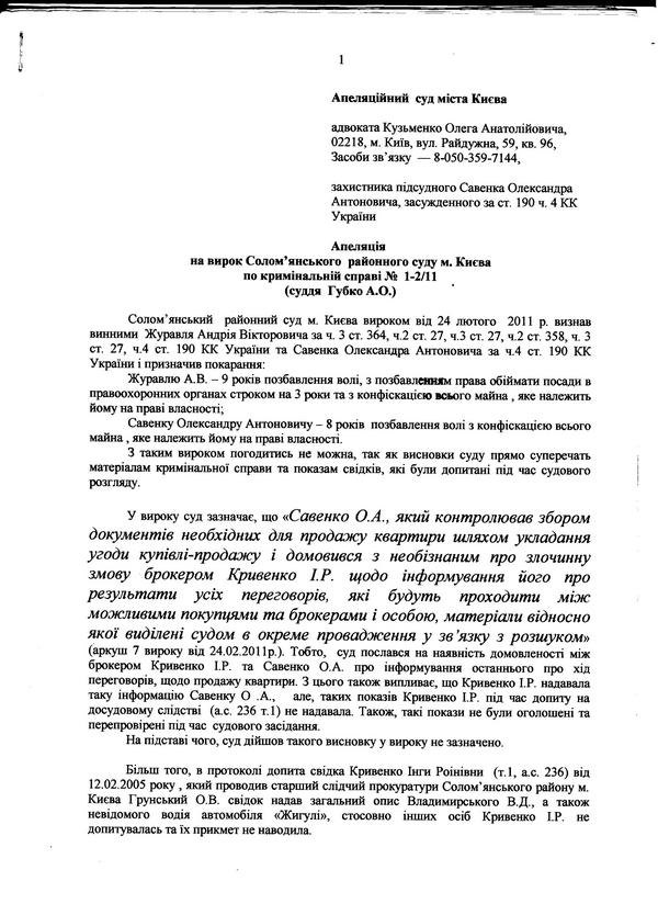 LB.ua публикует письмо двоюродной сестры осужденного Савенко А.А, а также копию апелляции к приговору, вынесенному Соломенским районным судом города Киева. Оба документа - о нарушениях закона, имевших место во время судебного разбирательства, и необоснованности решений, вынесенных судом.