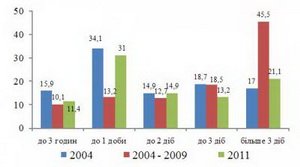 Еще одним важным фактором является своевременное доставление в суд. Возможность суду принять решение, определяющее дальнейшую судьбу задержанного, является одним из ключевых элементов правосудия (о чем говорит ст.5 Европейской Конвенции прав человека). Однако цепочка нарушений, возникающих в случае сомнительных по своей законности задержаний, продолжается и здесь. Среди опрошенных заключенных, 48, 2 % указали, что они были доставлены в суд позже, чем через 72 часа после задержания. Опрос заключенных при оценке периода 2004 - 2009 гг.. показывал, что практически половина опрошенных (45, 5%) заключенных провели в кабинетах, коридорах и других помещениях более 3 суток, прежде чем их поместили в ИТТ (Рис.). Цифры 2011 года возвращают нас к ситуации 2004 года. Так, наибольшее количество опрошенных (31%) провели в милиции до суток, прежде чем их поместили в изолятор временного содержания. Количество опрошенных заключенных, помещенных в изолятор позже чем 3 суток после пребывания в райотделе снизилось практически вдвое и тем не менее составило более пятой части (21, 1%).