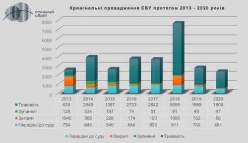 За последние 8 лет СБУ в среднем за год регистрирует 3500 дел. Из них средний процент переданных в суд — 22,9%, закрытых — 10,8%, остановленных — 3,6%, таких, продолжаюся (незаконченных) — 62,7%.