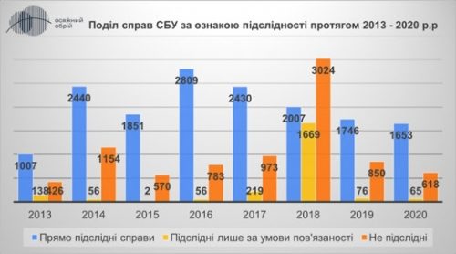 В то же время актуальным показателем того, что СБУ использует функцию расследования не по назначению, является разделение расследованных ею дел, учитывая формальную принадлежность дел к сфере государственной безопасности.