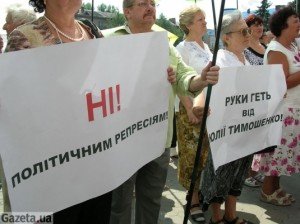 Люди тримали в руках транспаранти "Руки геть від Юлії Тимошенко!", "Ні – політичним репресіям!", "Не вір! Не бійся! Не проси!" та ін.