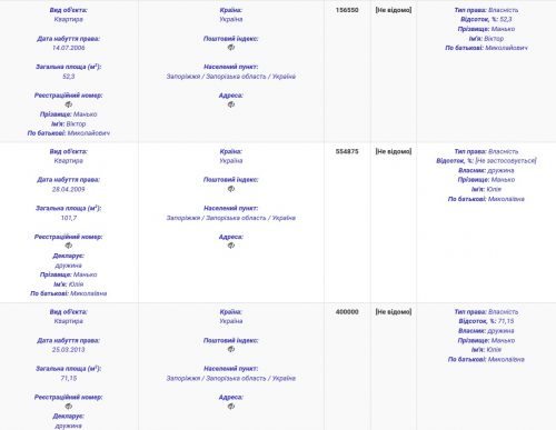 Согласно поданным декларациям у Манько в собственности 3 квартиры, 2 из которых зарегистрированы на не работающую жену, а также 2 автомобиля: «BMW X5» 2007 г.в. стоимостью 50 тыс. долларов и «Volkswagen Sirocco» 2011 г.в стоимостью 35 тыс. долларов.