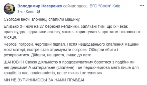 Неизвестные сожгли автомобиль депутата Киевского городского совета Владимира Назаренко (фракция «Всеукраинское объединение «Свобода») в Киеве. Об этом депутат написал в Facebook:»Сегодня ночью преступники сожгли машину. Около 3-х ночи на 27 марта негодяи, запуганные тем, что их ждет правосудие, подожгли машину, которой я пользовался в течение последнего месяца», — сообщил депутат.