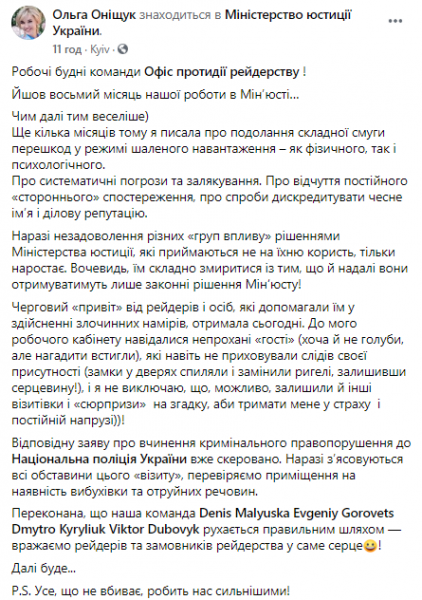 Неизвестные лица взломали кабинет Ольги Онищук, заместителя министра юстиции Дениса Малюськи. По факту взлома она написала заявление в Нацполицию и увязала его со своей работой.