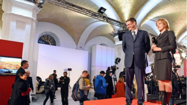 Штаб команды Порошенко располагался там же, где и на президентских выборах, - в "Мыстецьком Арсенале". Но если в прошлый раз в штабе толпились VIP-гости, то в воскресенье вечером там были только журналисты и несколько политиков. В том числе, два первых номера блока - Виталий Кличко и Юрий Луценко.
