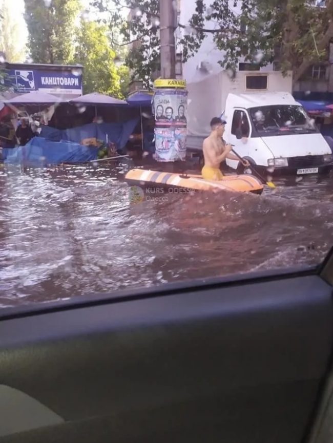 А изобретательный одессит плавал по улицам на надувной лодке.