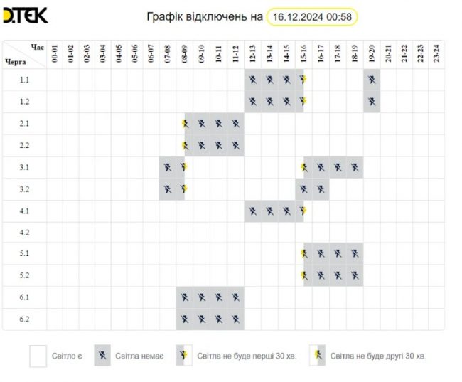 • Актуальный график обновляется каждый день – с сегодняшнего дня на завтра. Вот так, к примеру, выглядит расписание отключений на 16 декабря: