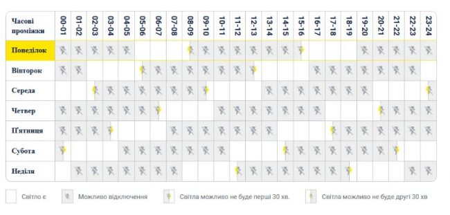 • Расписание возможных отключений на неделю стало очень примерным. Теперь в нем доступны данные о часах, когда свет точно будет в случае отсутствия аварий («белые зоны»), все остальное время обозначено как «серая зона», в которой отключения возможны: