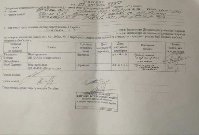 03.06.2020 и.о. президента Котин П.Б. издал приказ №404 «О распределении функциональных полномочий между вице-президентами ГП «НАЭК «Энергоатом». Пунктом 2 данного указа было установлено, что вице-президенты Галущенко Г.В. и Хартмут Якоб проверку знаний правил, норм и стандартов по ядерной и радиационной безопасности и правил технической эксплуатации должны проходить в Центральной экзаменационной комиссии ГП «НАЭК «Энергоатом», то есть у своих подчиненных, что делает такую проверку знаний бессмысленной, беспредметной и не объективной.