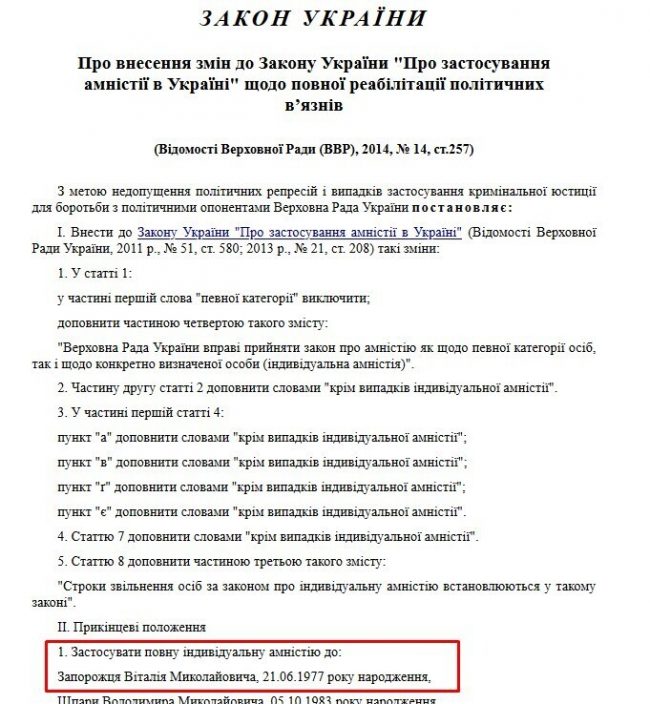 А на следующий день были приняты изменения в Закон «О применении амнистии в Украине» относительно полной реабилитации политзаключенных. Первым в списке был как раз Запорожец.
