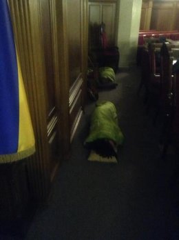 Возможно, моду на отдых в зале заседаний ввели депутаты Верховной Рады. В феврале оппозиция во время блокирования парламента спала сначала в креслах, а потом расположилась в проходах сессионного зала. Депутаты принесли с собой спальники. Правда, тогда дело было ночью, и депутатам не нужно было заниматься своими прямыми обязанностями.