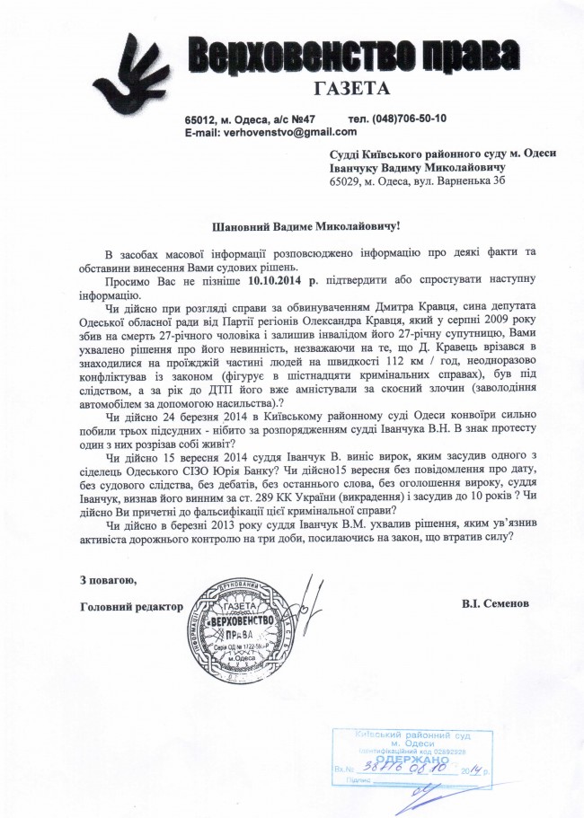 Судья Киевского районного суда г. Одессы Вадим Николаевич Иванчук предоставил ответ на запрос газеты «Верховенство права» по поводу некоторых скандальных судебных дел, находящихся в его производстве.