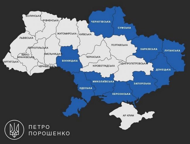 Законом Украины об утверждении указа президента территория действия военного положения ограничена 10 областями: Винницкой, Луганской, Николаевской, Одесской, Сумской, Харьковской, Черниговской, Донецкой, Запорожской и Херсонской областями, а также внутренними водами Азово-Керченской акватории.