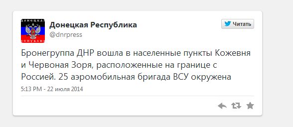 "Бронегруппа ДНР вошла в населенные пункты Кожевня и Червоная Заря, расположенные на границе с Россией. 25 аэромобильная бригада ВСУ окружена", — говорится в микроблоге ДНР в Twitter.