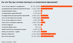 На новостном сайте From-UA   был проведен опрос среди читателей, за что б они смогли кинуть в политиков фекалии. Ответы оказались разносторонними, от обычной «плохой уборки снега» до «предательства интересов украинской нации». Некоторые, предложили заменить предложенный вариант на кирпич, мол, будет куда эффективнее.