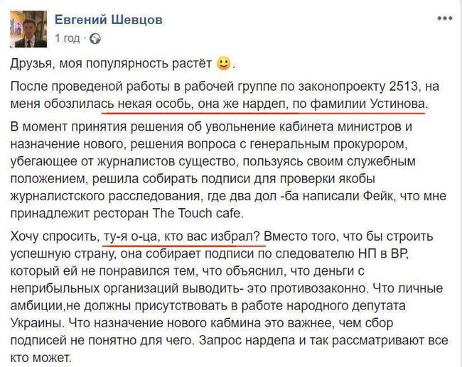 «На мою квартиру наложили арест, а машину объявили в розыск. Такие себе будни депутата И если что — это не первоапрельская шутка, а новый «привет» от нашей новой «реформированной» полиции. Все потому, что должна оплатить почти 80 тыс. грн компенсации за причиненный моральный вред целому заместителю Главного следственного управления полиции! Помните некоего Евгения Шевцова — публично на своей странице в ФБ обозвал меня всеми возможными эпитетами от «бродячего животного» до «тупой овцы» и многими другими эпитетами, на что я ему скромно ответила, что такой человек недостоин носить звание офицера! Так вот — после полугодового «расследования» внутренняя безопасность национальной полиции сказала, что Женя «ни при чем»! Это оказывается не он писал, потому что кто-то его ФБ хакнул, ну а потом просто взял и вернул назад», — говорится в сообщении.