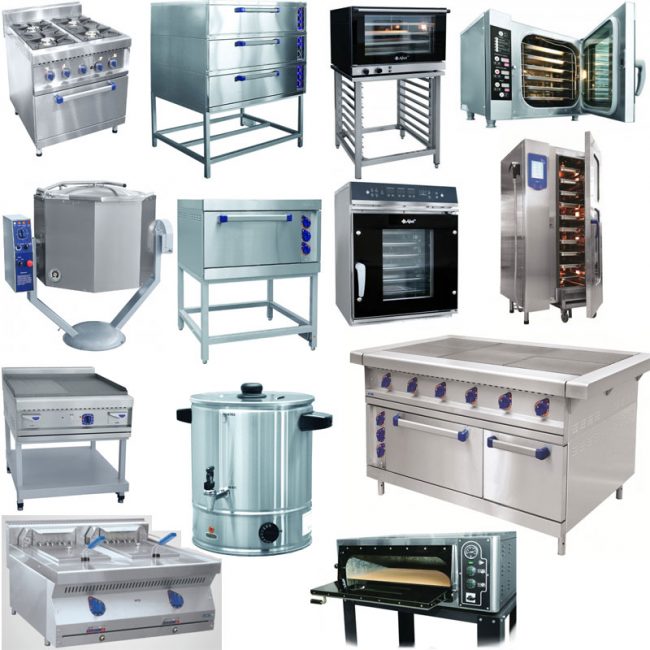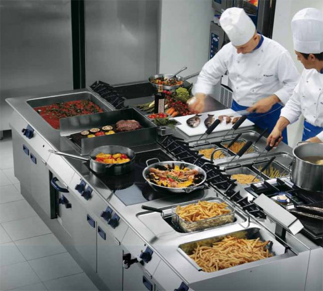 Изначально продукт поступает на склад, где проверяется на соответствие нормам и распределяется для хранения с использованием холодильного оборудования, полок или шкафов. Отсюда продукты поступают в горячий или холодный цех. В первом тепловая обработка производится с использованием плит, пароконвектоматов, жарочных поверхностей и духовых шкафов. Электромеханическое оборудование – овощерезки, мясорубки, миксеры и блендеры являются вспомогательными приборами для создания холодных закусок и салатов. Раздаточный участок представляет собой комплекс удобно расположенных столов для оформления блюд перед подачей официантами.