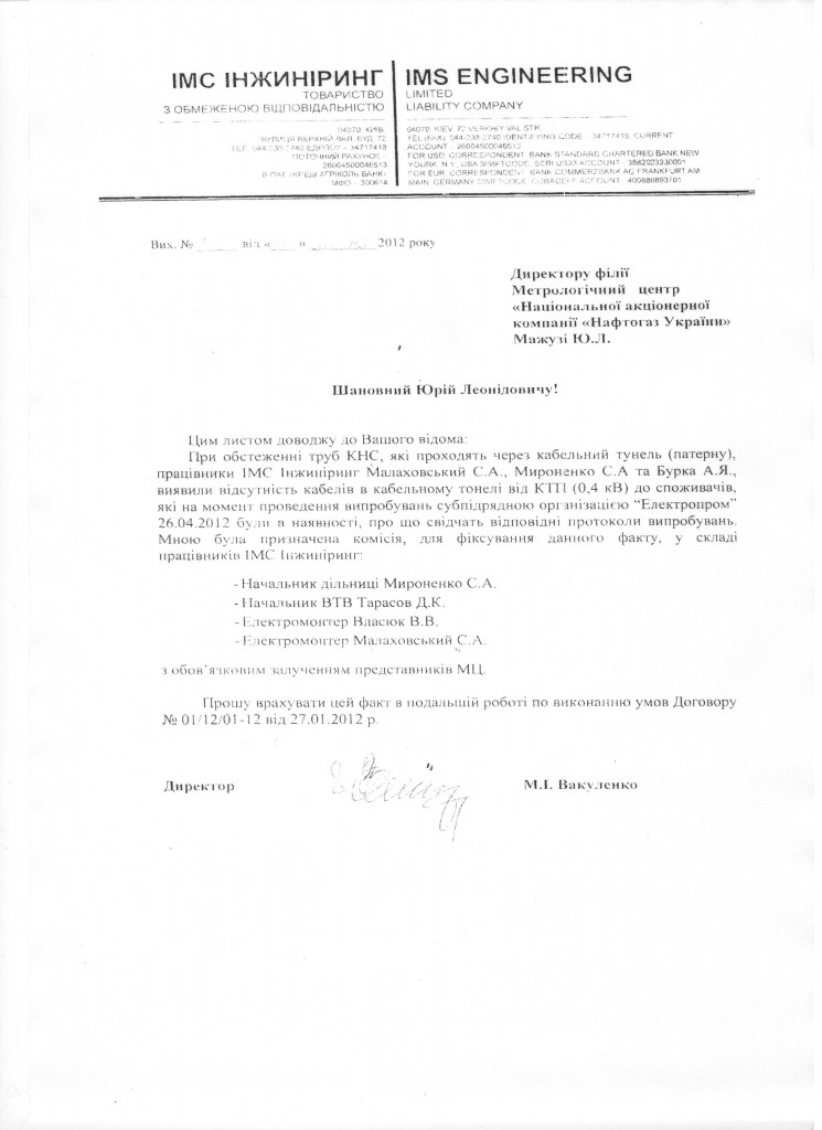 Итак, согласно словарям и энциклопедиям «метрология» — наука об измерениях, методах и средствах обеспечения их единства и способах достижения требуемой точности. Предметом метрологии является извлечение количественной информации о свойствах объектов с заданной точностью и достоверностью. Как видно, основная цель метрологии в любой прикладной отрасли – точность и достоверность. Метрологический центр, строящийся в Украине, безусловно также должен обеспечивать точность и достоверность. Для обеспечения точности и достоверности Метрологическим центром используются автоматизированные и компьютеризованные системы управления. Эти системы управления передают данные, используя проложенные в толще сооружений Метрологического центра кабели. Внезапно, неизвестными лицами в период весна-лето 2012 года часть кабелей срезается и увозится (фактически, совершается кража государственного имущества). Вот письмо, подтверждающее изложенные факты.