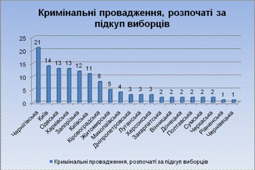 Больше всего подкупов зарегистрировано в Черниговской (21), Одесской (13), Харьковской (13), Запорожской (12) областях и городе Киеве (14). Из начатых в 9-ти уголовных процессах лицам сообщено о подозрении, из которых в 2-х - по фактам подкупа избирателей.
