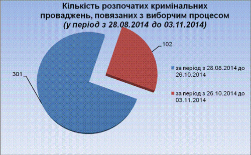 По этим обращениям открыто 403 уголовных производства, из которых 301 - в период проведения агитационной кампании (с 28 августа до 26 октября 2014 г.) и 102 - в период голосования и установления результатов выборов (с 26 октября по 03 ноября 2014 г.).
