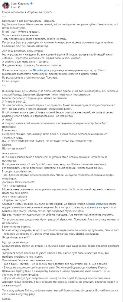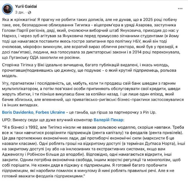 Причем Тигипко имел определенные заслуги перед Майданом: сыграл большую роль в потере Януковичем большинства в Верховной Раде в феврале 2014 года. Да и в последние 10 лет вообще он никак в политике не участвовал. Тем не менее его фактически заклеймили как врага народа.
