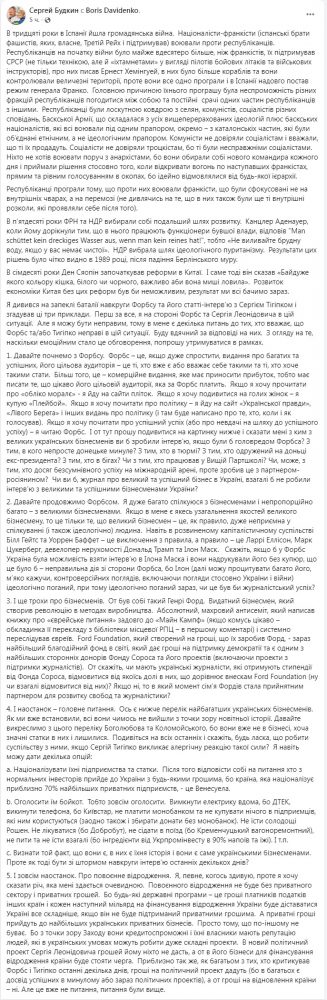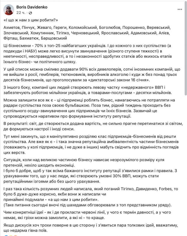 В ответ на претензии Борис Давиденко написал, что к большинству богатых людей Украины есть те или иные претензии идеологического и коррупционного характера, поскольку они вели свой бизнес при любой власти и так или иначе были с ней связаны.
