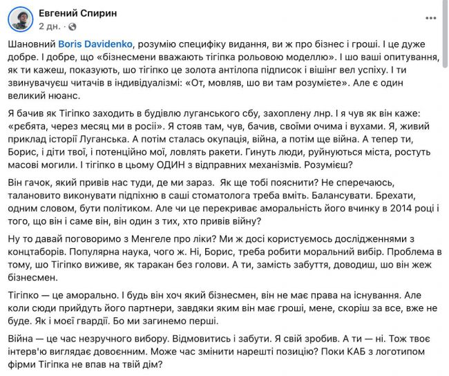 Автора интервью и главреда издания Давиденко начали обвинять в непатриотичности. Ему писали, что рекламировать Тигипко аморально и что как публичная личность банкир «не имеет права на существование».