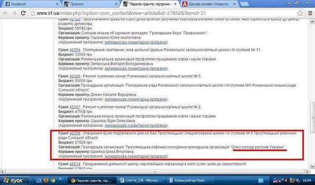 "В 2010 году Тростянецкая организация "Союз молодежи регионов Украины" получил 67,9 тысяч гривен от фонда "Возрождение" господина Сороса. Я считаю, что надо немедленно найти изменников и наказать!", - дописано к принт-скрину документа.