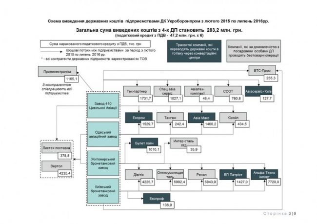 Как установили следователи Шевченковского управления полиции ГУНП в г. Киеве, только четыре предприятия концерна «Укроборонпром» – ГП «Житомирский бронетанковый завод», ГП «Киевский бронетанковый завод», ГП «Одесский авиационный завод» и ГП «Завод 410 гражданской авиации» через фиктивные «ооошки» и с завышением объемов налогового кредита заключили договоры на поставку фейковых услуг, работ и товаров на общую сумму 283 200 000 грн.