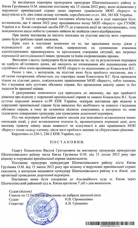 Шевченковский райсуд Киева удовлетворил иск Василия Ковальчука, касающийся его избиения сотрудниками "Беркута" во время акций протеста под Украинским домом в прошлом году.