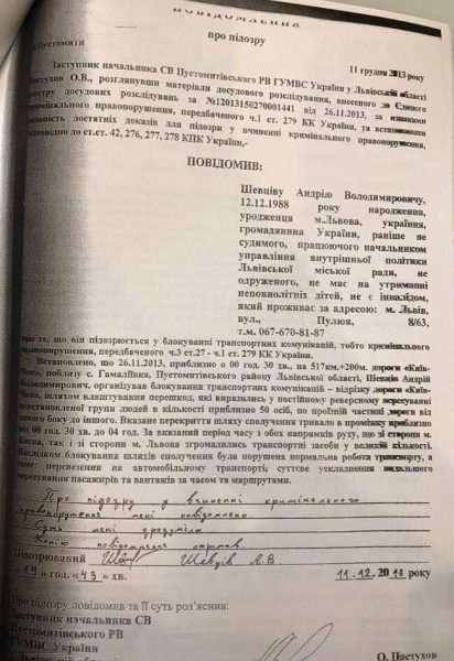 Мы расспросили депутата Львовского городского совета Андрея Шевцива, который фигурировал в уголовном производстве, где процессуальное руководство осуществляла Пустомитовская прокуратура и подозрение которому согласовывал непосредственно Роман Труба. Оба процессуальных документа — ходатайство о применении предупредительной меры в виде личного обязательства и сообщения о подозрении — подписаны нынешним директором ГБР.