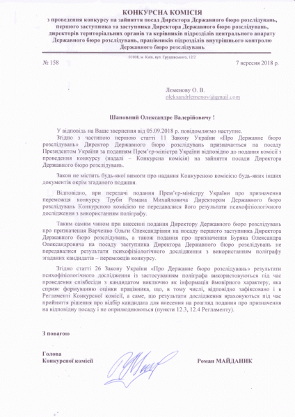 Поэтому, принимая во внимание постоянные манипуляции Романа Трубы относительно полиграфа, опубликуем ответ внешней комиссии. Согласно ее письму, закон не содержит требования о предоставлении комиссией каких-либо других документов при передаче представления премьер-министру Украины о назначении победителя конкурса Романа Михайловича Трубы директором ГБР. Так что комиссия не передавала его (Трубы) результаты психофизиологического исследования с использованием полиграфа.