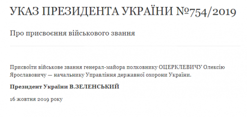 «Присвоить военное звание генерал-майора полковнику Оцерклевичу Алексею Ярославовичу — начальнику Управления государственной охраны Украины», — говорится в указе.