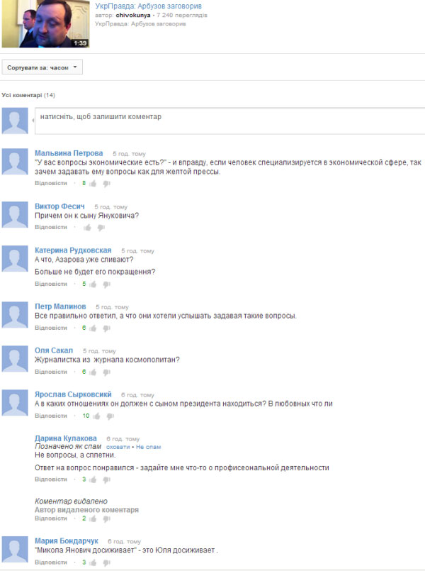 По его словам, во вторник было размещено видео на Youtube с интервью Арбузовым. В тот же день, ближе к вечеру, новость ушла в архив. Спустя пару дней, к ней стали приходить комментарии. Вроде бы нормальное явление, но есть одно большое НО. До этого момента, за три дня пришло всего шесть комментариев, а тут за полчаса –восемь и все со словами поддержки в адрес Арбузова! Лещенко решил поинтересоваться, кто все это написал.