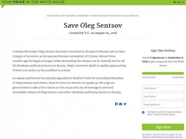 Петиция в поддержку незаконно заключенного в РФ Олега Сенцова и других пленников Кремля, размещенная на сайте Белого дома, собрала необходимые 100 000 подписей. По состоянию на 11 часов утра 6 сентября под  петицией  подписались 100 523 человека. Об этом сообщает "Укринформ" .