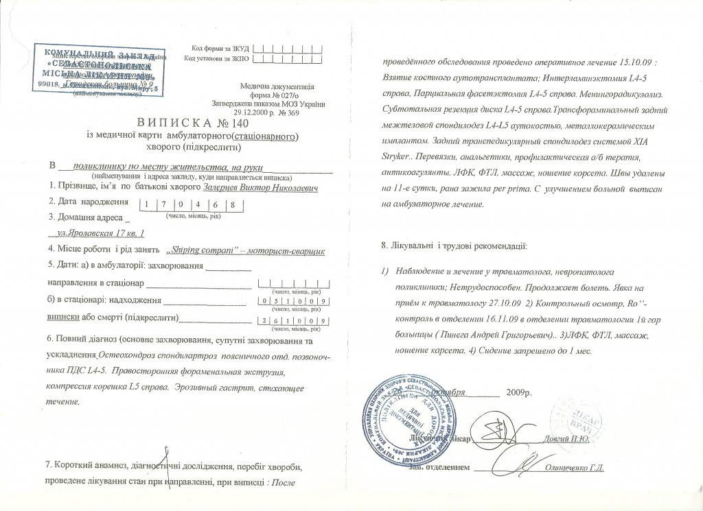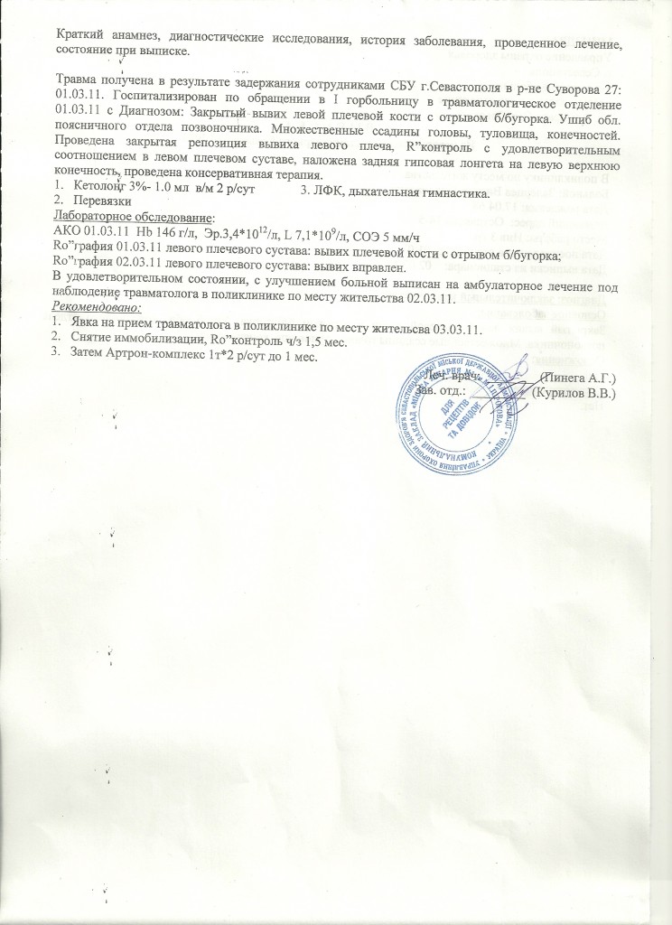 Я - Залерцева Елена Владимировна . В отношении моего мужа Залерцева В. Н. были совершены противоправные действия , предположительно, сотрудниками СБУ. Мой муж - инвалид 3-ей группы здоровья после перенесенной тяжелой операции на позвоночнике. Его грубо избили , и по чистой случайности обошлось только вывихом плечевой кости с переломом б/бугорка , а также ушибом позвоночника и многочисленными ссадинами . Если бы хоть на 1-2 миллиметра сдвинулись титановые пластины , которыми скреплены у него 2 позвонка , дело могло бы закончиться параличом нижних конечностей.