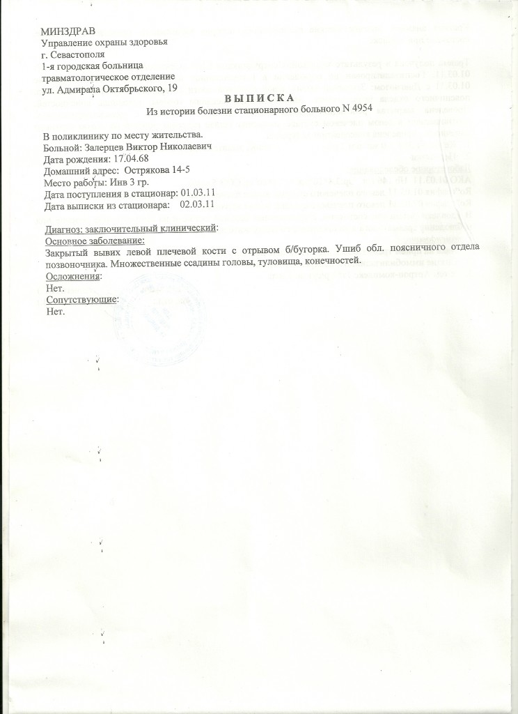 Моя жена – Залерцева Е. В. отвезла меня в травмпункт и в дальнейшем я был госпитализирован с диагнозом : Закрытый вывих левой плечевой кости с отрывом б/бугорка . Ушиб области поясничного отдела позвоночника . Множественные ссадины головы , туловища , конечностей.