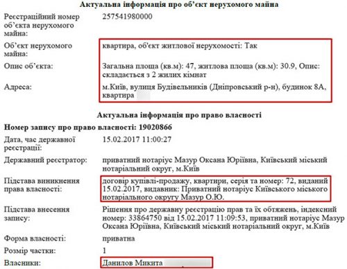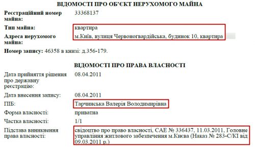 Отдельного пояснения требует еще один факт. В реестре прав на недвижимое имущество до сих пор указано, что Валерия Тарчинская была владелицей квартиры по адресу: г.Киев, улица Строителей, 8а. И скорее всего эту квартиру она продала в 2017 году и ее нынешним владельцем является другое лицо. И если это действительно так, то это является нарушением. Ведь эта квартира не была указана в декларациях чиновника, как и не было указано факта ее продажи.