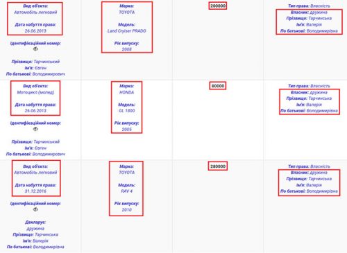 Не менее роскошным есть и движимое имущество семьи. Впрочем, как и с недвижимостью — всеми автомобилями владеет Валерия Тарчинская. Первым автомобилем является TOYOTA Land Cryiser PRADO 2008 года выпуска. Владелицей этого авто Валерия Владимировна стала 26 июня 2013 за 200 тыс. Грн (25 тыс. У. Е.). В тот же день 26.06.2013 госпожа Валерия завладела мотоциклом HONDA GL 1800 2005 года.