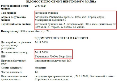 Однако в один день, 16.06.2017, дом вместе с землей был подарен Елене Григорьевне Тимченко — матери Валерии Тарчинская.