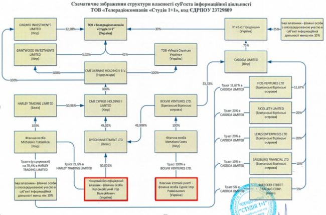 Схема структуры собственности «Телерадиокомпании» Студия 1 + 1 «. Нажмите для увеличения