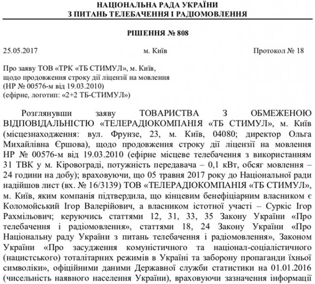Телерадиокомпания подтвердила, что ее конечным бенефициарным владельцем является Игорь Коломойский, а владельцем существенного участия — Игорь Суркис. Только после этого Нацсовет продлил действие лицензии регионального телеканала. То есть тогда Нацсовет невольно установила факт связанности двух олигархов.