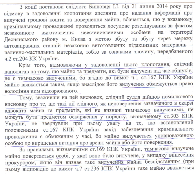 К сожалению, и следственные судьи не любят признавать свои ошибки, особенно когда без должных на то оснований дают разрешения на обыск предприятия. Поэтому жалобы предприятия в Деснянский районный суд города Киева практически не дали результата. Чего не скажешь о достаточно объективном решении Апелляционного суда города Киева, который указал, что предприятие, у которого производится изъятие, является полноправным участником уголовного процесса и имеет законное право и возможность отстаивать свои интересы в суде, в частности, в вопросах возврата незаконно изъятого имущества, о чем красноречиво свидетельствует решение Апеляционного суда города Киева от 07.08.2014 года. Публикуем выдержки.
