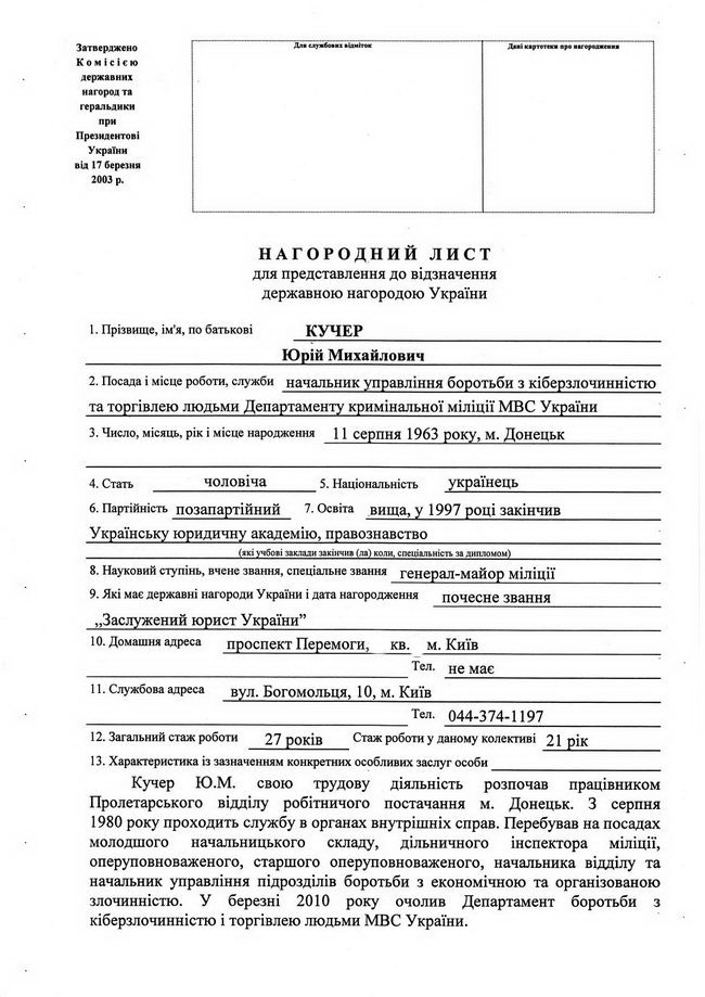 Читаешь наградное ходатайство на Кучера и слезы наворачиваются: какого человека журналюги ославили! Впрочем, не все упомянуто в официальном документе. К подвигам его подразделения следовало бы также добавить активные DDOS-атаки нашего сайта силами подчиненных из службы по борьбе с киберпреступностью – сразу после выхода публикации на «ТЕМЕ». Архиважное дело за деньги налогоплательщиков совершили хакеры в погонах. Потому что общеизвестно: интернет журналисты – это те козлы, которые мешают служить таким людям, как генерал Кучер. Ну а многолетняя деятельность борделей под стенами ГУВД Киева, о чем прекрасно известно генералу Кучеру - это мелочи. Если всех сразу победить, то за что тогда получать очередные звания и награды?