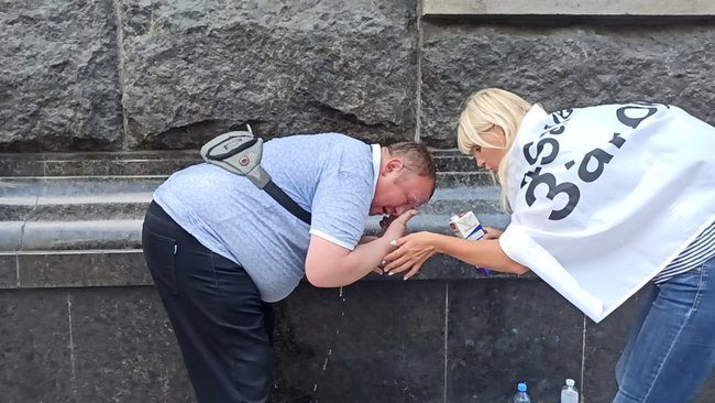 Кроме того, протестующие принесли крышку гроба, похоронные венки и траурные ленты.