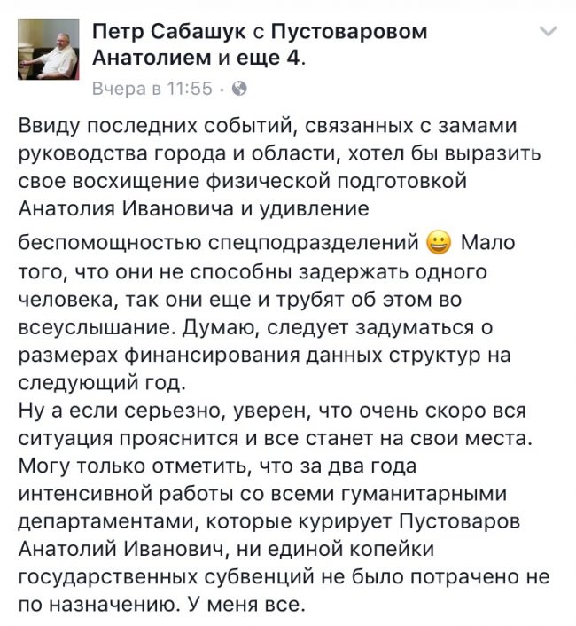 Местный бюджет громады получал «дырку от бублика», а сверхприбыль делилась. Вот и подключили Сабашука: «Могу только отметить, что за два года интенсивной работы со всеми гуманитарными департаментами, которые курирует Пустоваров Анатолий Иванович, ни единой копейки государственных субвенций не было потрачено не по назначению. У меня все». Пост в Фейсбуке спустя какое-то время пропал, но скриншоты не горят.